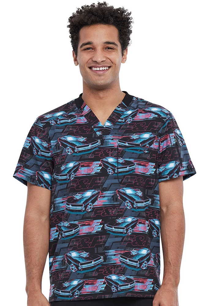 Keep your eyes on the prize in the Tooniforms by Cherokee Men’s Fast And Furious Print Scrub Top. This fun, colorful racing print is great for car-lovers and movie buffs alike.