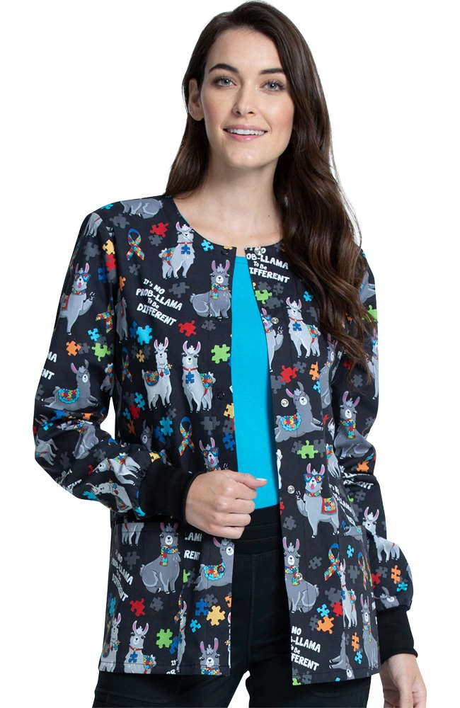 The Fashion Prints by Cherokee Women’s Llama Love Print Scrub Jacket is an adorable reminder to celebrate what makes us different. The Autism Awareness puzzle prints and llama characters makes for an unforgettable look.