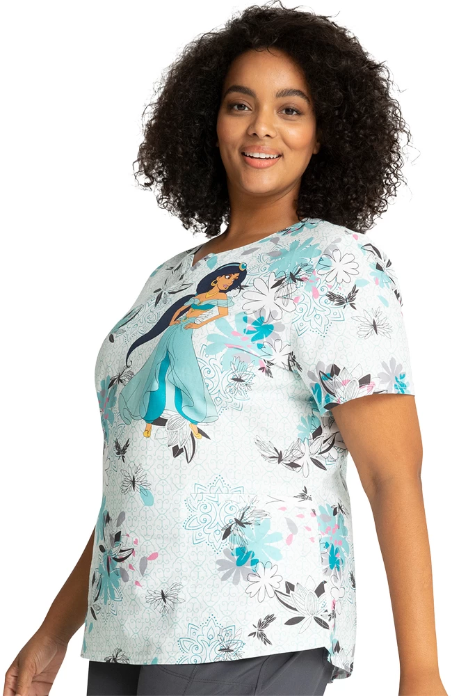 Follow your heart and your dreams in the Tooniforms by Cherokee Women’s Lotus Garden Print Scrub Top. This Aladdin-themed top features a notched neckline and flattering seamed details.