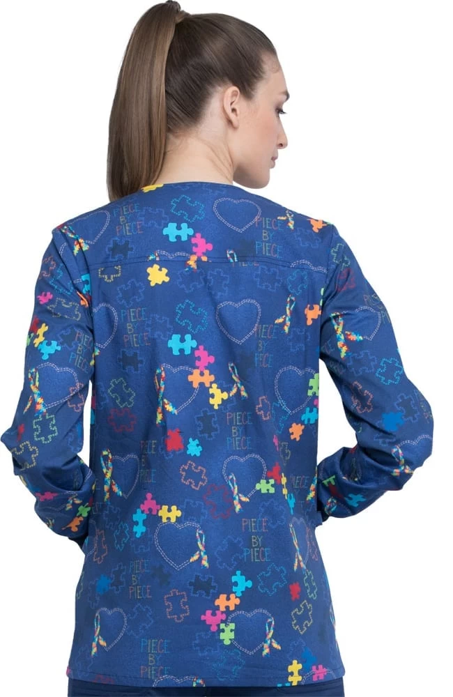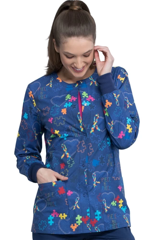Speak your truth with the powerful Fashion Prints by Cherokee Women’s Piece Of My Heart Print Scrub Jacket. This warm and cozy scrub jacket features an Autism Awareness puzzle piece print along with inspiring quotes.