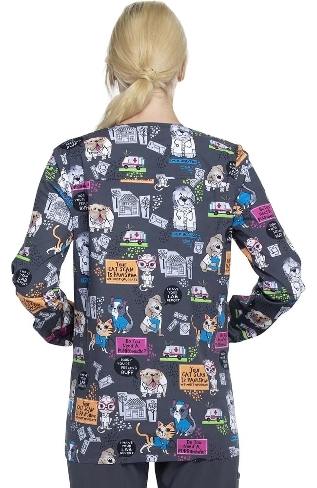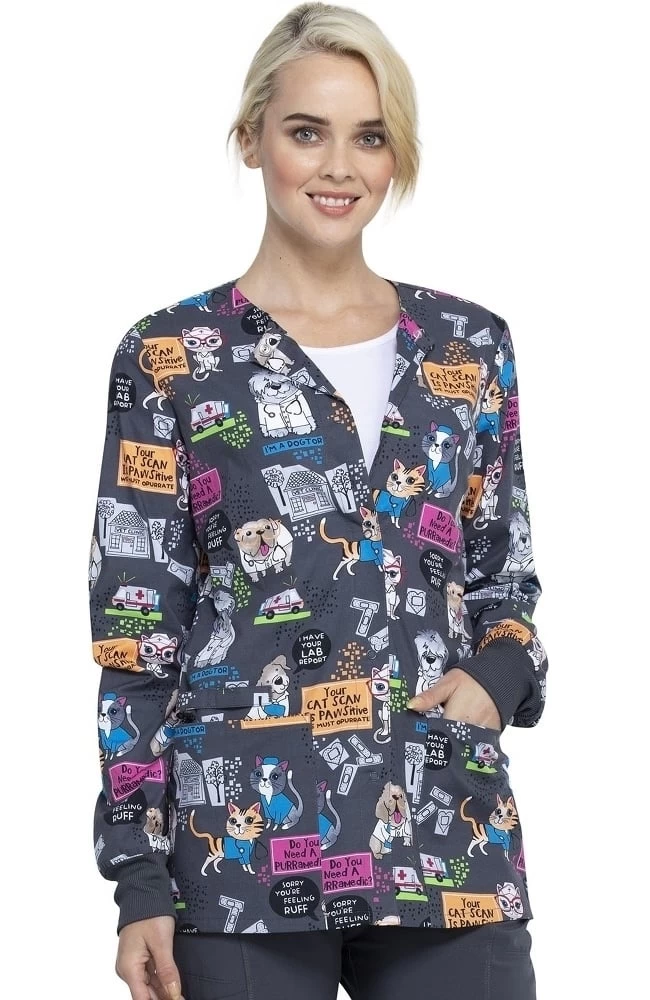 Select the purrfect accessory to keep warm on your rounds with the Fashion Prints by Cherokee Women’s Purramedics Print Scrub Jacket. This chic and unique animal-themed print is packed full of puns, pets and positivity.