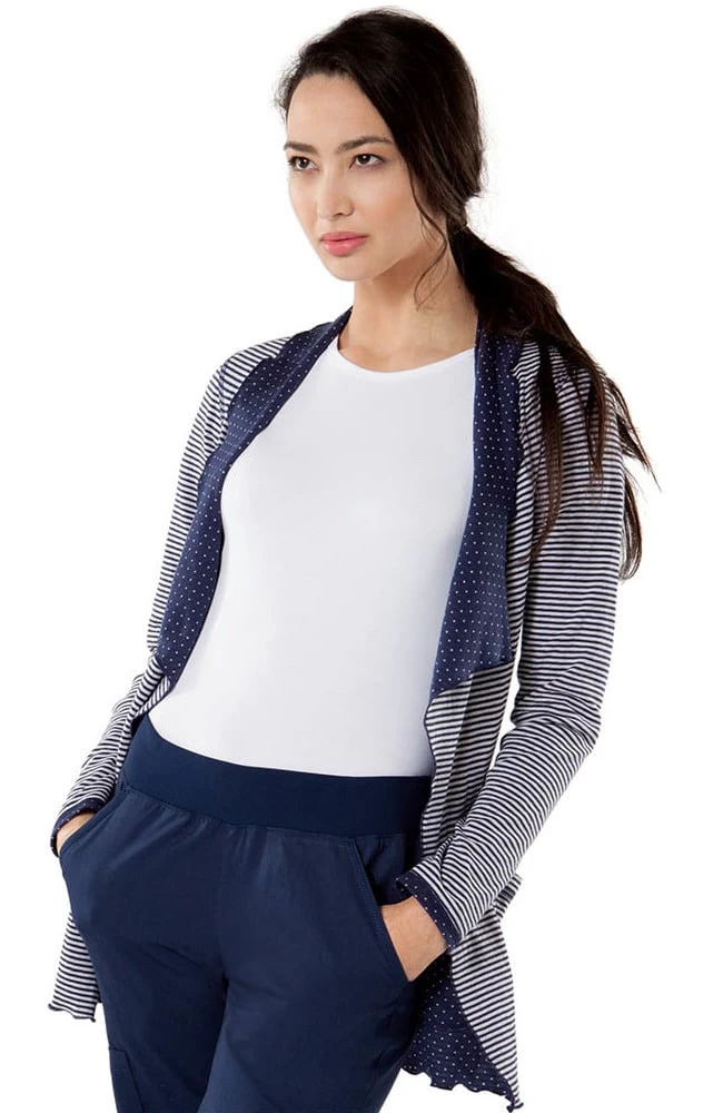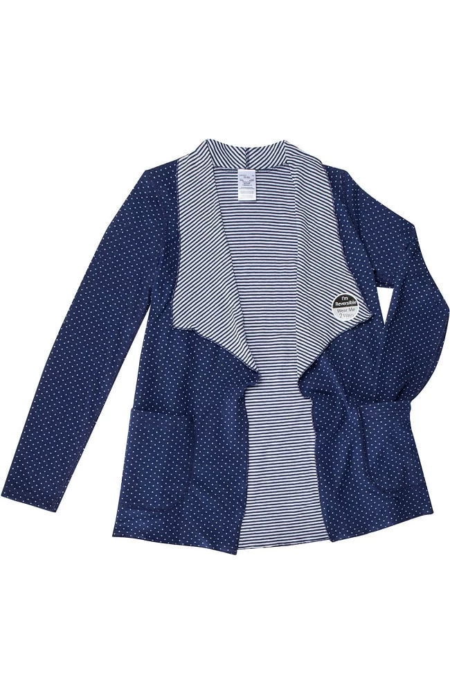 Add some fun along with some warmth with this reversible long sleeve warm up. It features dots and stripes. Wear its mini pin dot side for a modern, classic look, or show off its stripe side for a bolder, modern feel. It also featured is an on-trend waterfall cut front, back princess seams for shaping and patch pockets on both sides. The fabric is a cotton/poly jersey knit.