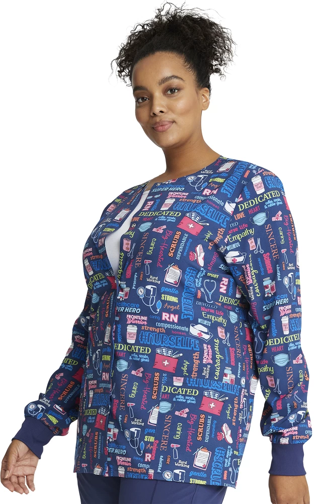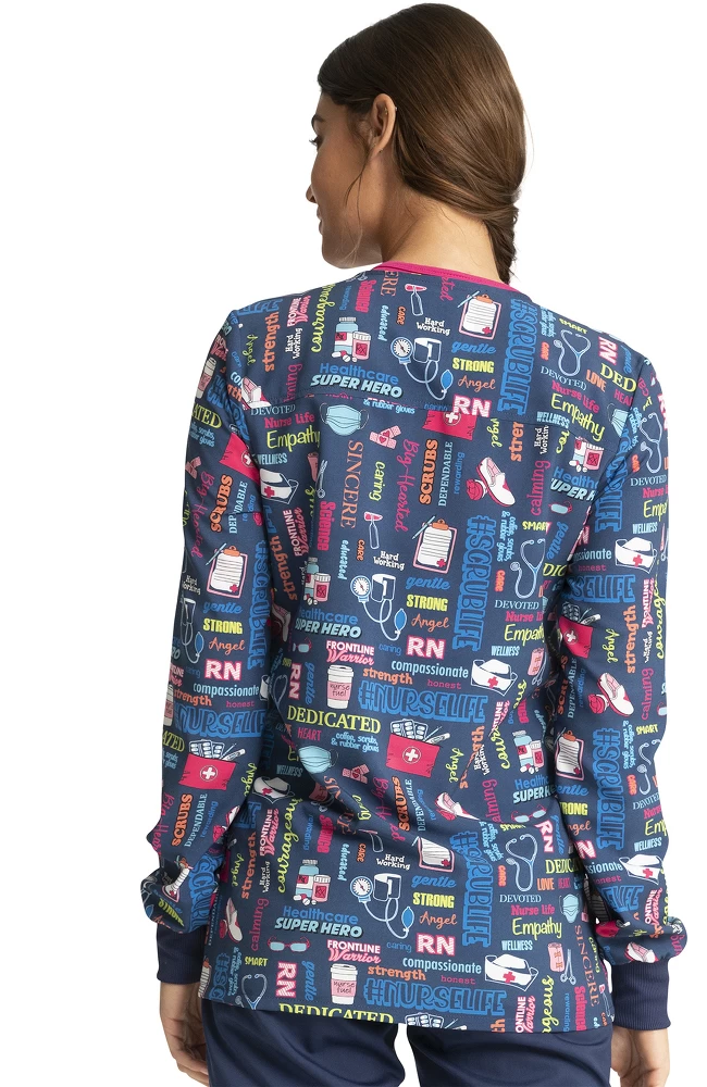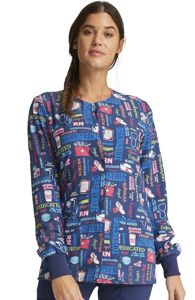 Layer your look and show your love for what you do with the Fashion Prints by Cherokee Women’s Snap Front Scrub Life Print Jacket. Utility loops and ribbed cuffs make this jacket both fun and functional.