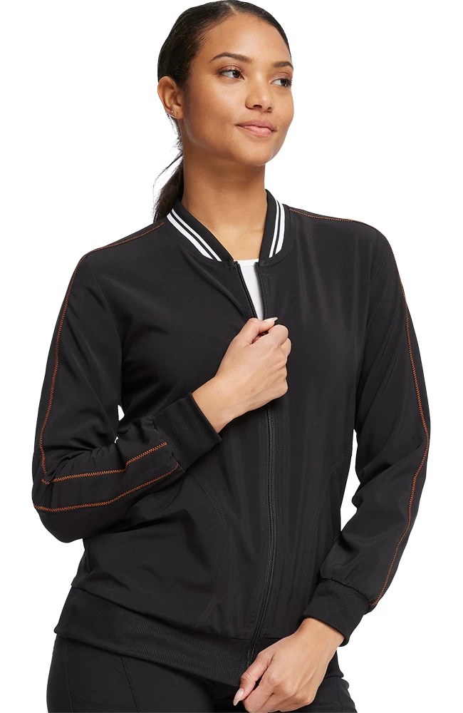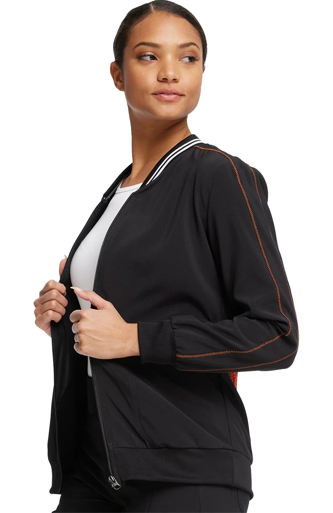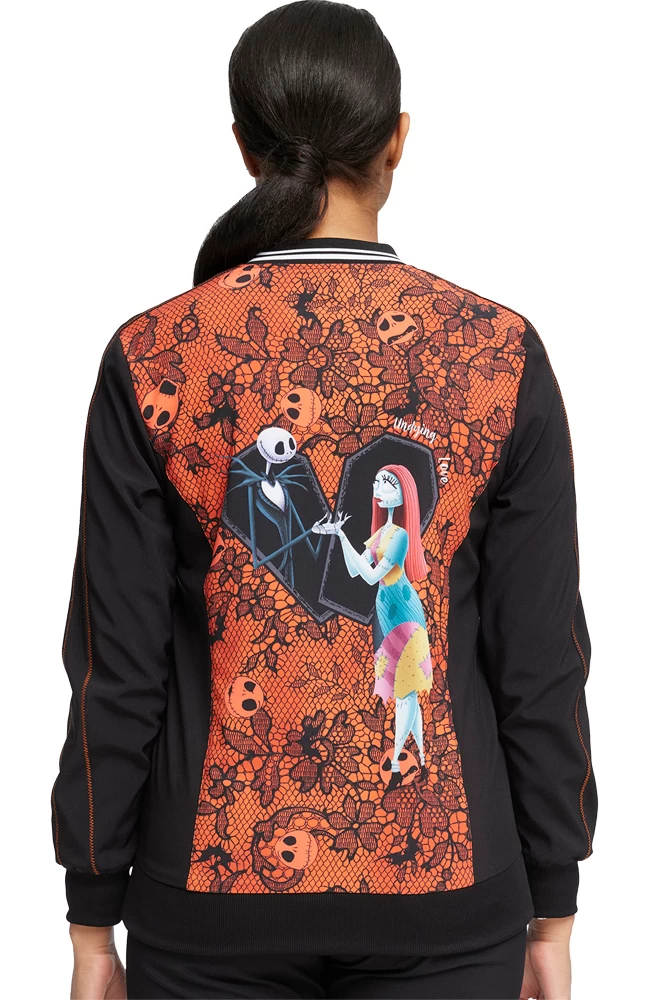 Give your scrub style some edge with the Nightmare Before Christmas-themed Tooniforms by Cherokee Women’s Undying Love Print Bomber Jacket. The orange lace print back adds a touch of spooky romance, while the solid black front keeps the look casually cool.