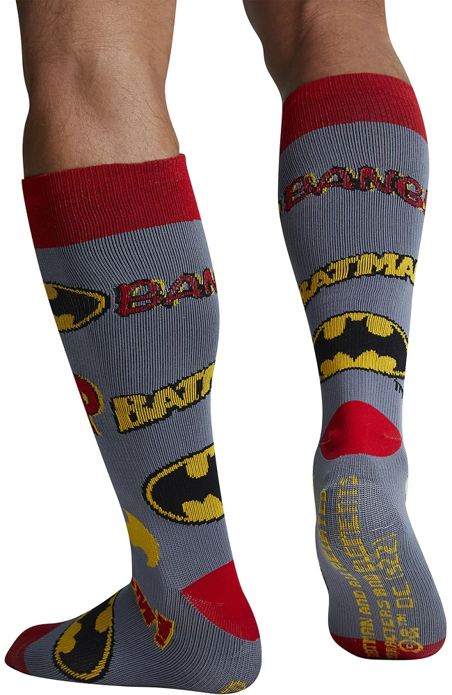 Feel like a superhero in the Tooniforms by Cherokee Men’s Support 8-12 mmHg Batman™ Mania Compression Sock. This pair combines an action-filled Batman design with graduated compression to give you relief during long shifts.