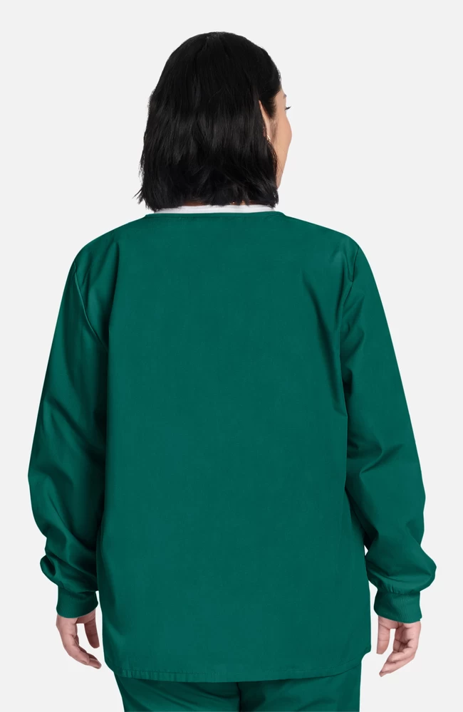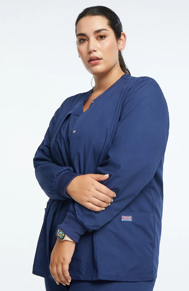 From Cherokee Workwear Originals, this jewel neck warm-up scrub jacket comes in many rich solid colors with four color-matched snap closures, making it a great uniform choice. It has rib knit cuffs, two patch pockets, and a peek-a-boo cell phone pocket. This jacket is made of soil-release poly/cotton poplin that is both comfortable and durable. The length is 30″.