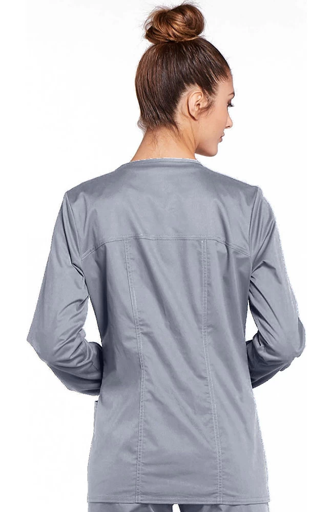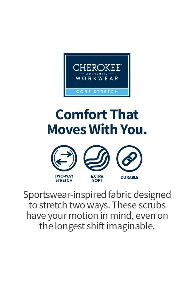 This jewel neck zip-front warm-up scrub jacket from Core Stretch by Cherokee Workwear has a touch of stretch. It features two patch pockets, the right side pocket is layered with a sectional pocket and I.D. loop. The flattering fit is shaped by a yoke and princess seams at the back, and raglan seams at the front. Matching knit cuffs make it cozy. The center back length is 27″.