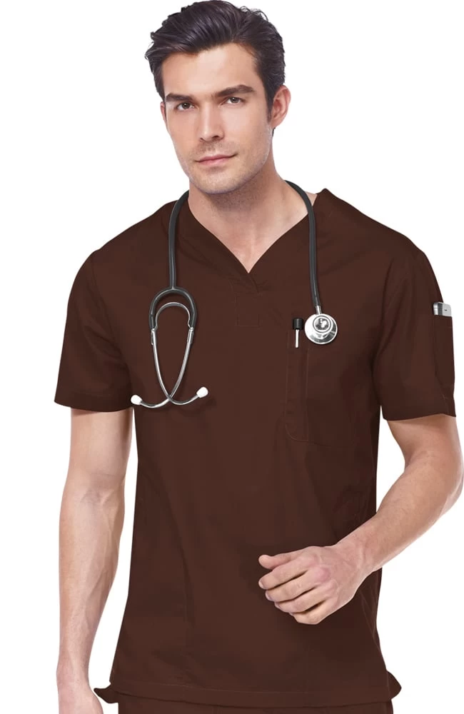 koi listened to your input and created a new men’s scrub top you’re going to love. This basic V-neck scrub top offers an amazing fit. Side slits keep the fit easy. It has Henley styling at the neck with zigzag stitching on the placket. There are welt pockets in the front with angled openings. There is also one patch chest pocket with a pen slot, one patch pocket on the sleeve. The fabric is a soft cotton/poly twill. The length is 29 1/2″.
