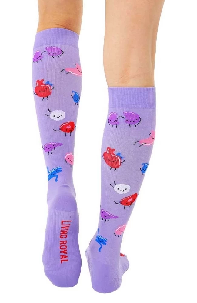 Move to your own beat in the Living Royal Unisex 15-20 Mmhg Lightweight Doctor Print Compression Socks. Multicolored hearts decorate the eye-catching purple print sock design.