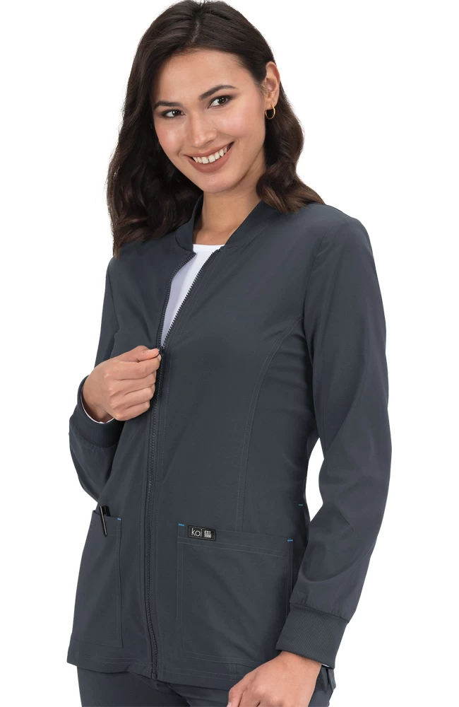 The koi Basics Women’s Andrea Zip Front Solid Scrub Jacket features flattering and utility details. Stay cozy in cool medical settings with this sleek scrub layer.