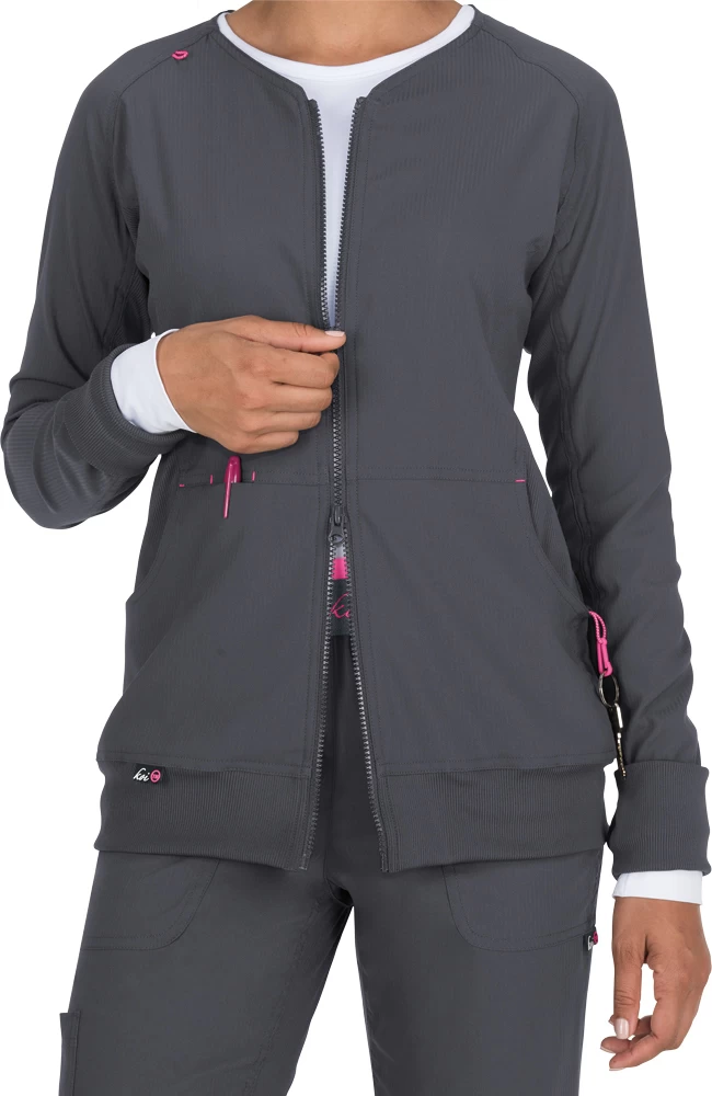 The koi Lite Women’s Clarity Zip Front Solid Scrub Jacket provides an extra layer of warmth in a sleek design. Elongated cuffs with thumb holes keep your hands cozy and your fingers free.