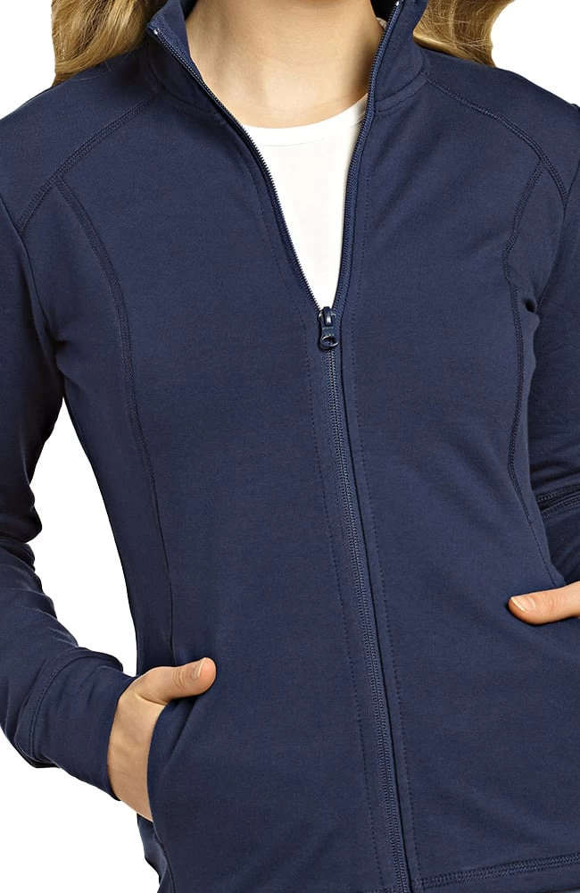 This French terry scrub jacket from Allure by White Cross will add warmth and a touch of sporty styling to your uniform. Cozy pockets are set into the front princess seams. The sport sleeves have knit cuffs.