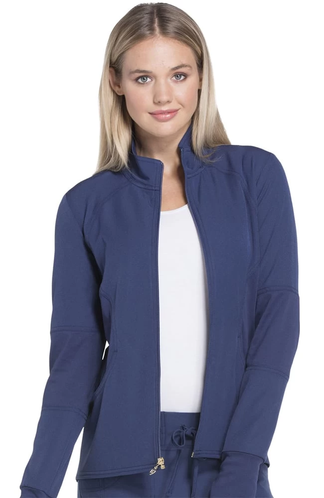 Rib knit details add to the sporty style of this Break On Through by heartsoul Women’s Zip Front Warm-Up Solid Scrub Jacket. A signature heat transfer logo and zipper pull add the feminine details you love.